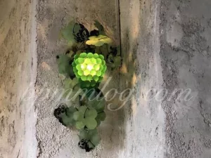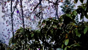 駐車場まですんなり行けたものの、どしゃぶりなのでしばし車の中で待機。少し雨が弱まったところでよし、いまだ!と美術館に向かい始めます。エントランス付近へ近づくと、カラフルなガラスの実がなっている木が見え始めます。小学生の娘2人をはじめ家族全員前半の空振りな旅を一気に忘れ、キラキラした世界へ引き込まれていきました。