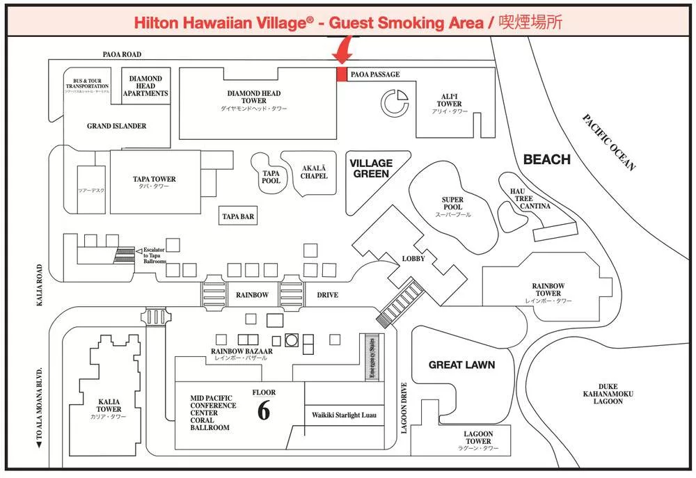 ヒルトン・ハワイアン・ビレッジでは、ダイアモンドヘッド・タワーとアリイ・タワーの間パオア・ロードに抜ける通路が指定喫煙エリアとなっています。