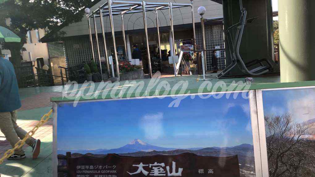 通路を抜けて左手にリフトのチケット売場がありますので、そこでチケットを購入してリフトへ向かいます。リフト前には大室山のパネルがあり、気分を盛り上げてくれます。