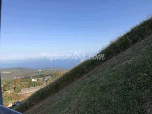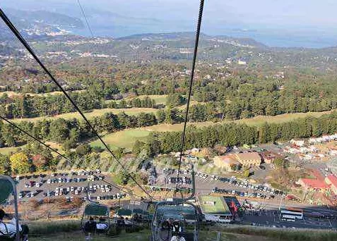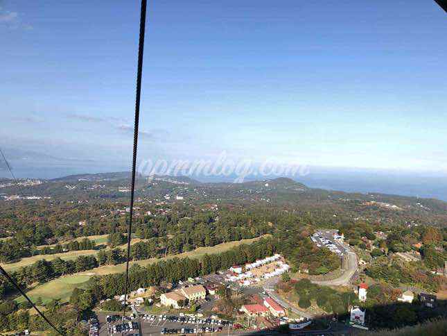 約6分ほどで山頂に到着するリフト乗車ですが、少し登っていくと相模湾が左手に見えてきてテンションも上がります!また後ろを振り返ると広がる景色がありますが、思っていた以上の急勾配で「落ちたら下まで転がり落ちそう」でブルッとしたので前を向きます。