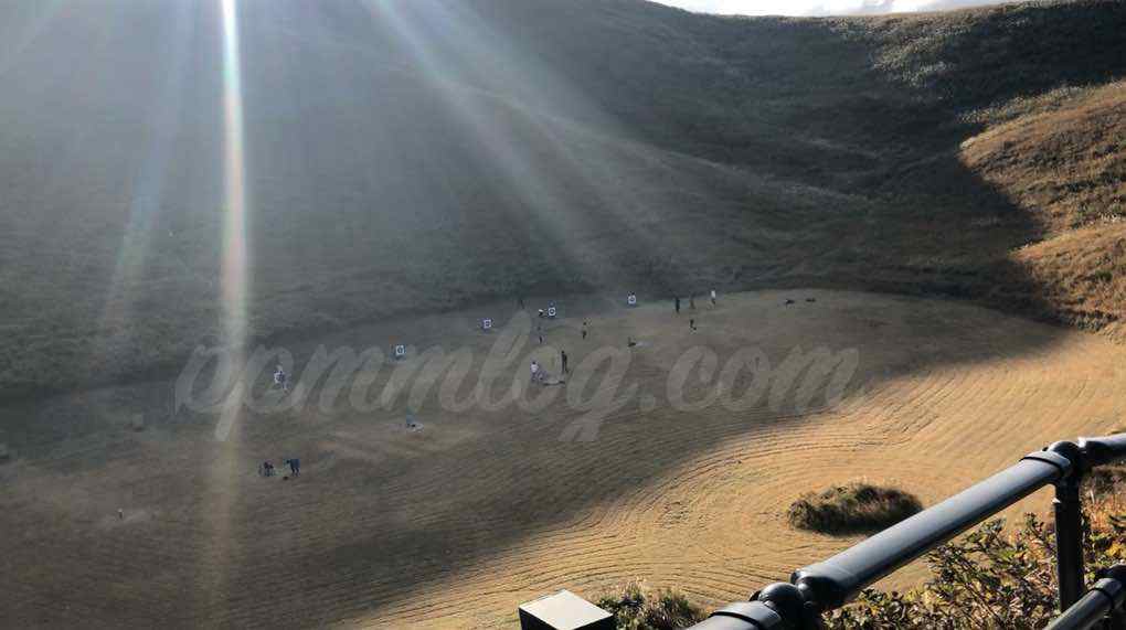 山頂へ到着すると左手にはお土産屋さん、正面にはすり鉢状となっている火口が見えて、アーチェリーをやっている姿が見えます。娘たちも興味津々でしたが、残念ながらアーチェリーは中学生以上からなので今回は断念。代わりにお団子を食べてご機嫌。